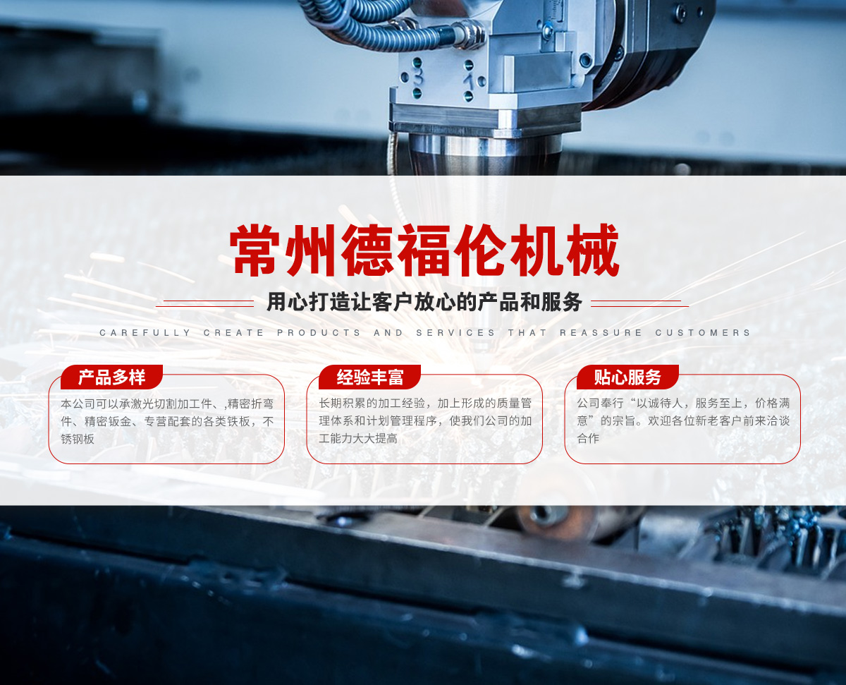 常州德福倫機(jī)械有限公司成立于2014年12月19號(hào),位于江蘇省常州市武進(jìn)區(qū)遙觀鎮(zhèn)建農(nóng)村劍童路56號(hào)西門;公司配備;1萬瓦通K激光切割機(jī)1臺(tái),6千瓦領(lǐng)C激光切割機(jī)1臺(tái);機(jī)器行程6米*2.2米,切割不銹鋼50mm,碳鋼30mm;300噸大型數(shù)控折彎?rùn)C(jī)。精密焊接機(jī)器數(shù)臺(tái)。本公司可以承激光切割加工件、,精密折彎件、精密鈑金、專營配套的各類鐵板,不銹鋼板。長(zhǎng)期積累的加工經(jīng)驗(yàn),加上形成的質(zhì)量管理體系和計(jì)劃管理程序,使我們公司的加工能力大大提高,滿足客戶所需,是我們公司的目標(biāo)!公司奉行“以誠待人,服務(wù)為上,價(jià)格滿意”的宗旨。歡迎各位領(lǐng)導(dǎo);老總前來洽談合作!